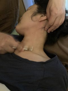 冷温器1本で使用。シワは左指を使いのばしながらの施術。冷温器は横に寝かせとにかくシワを伸ばしながらかけていきます。